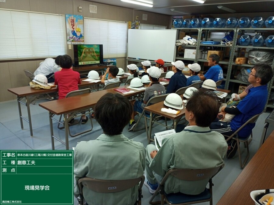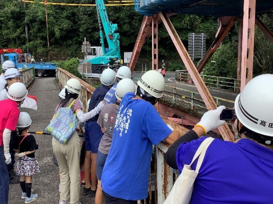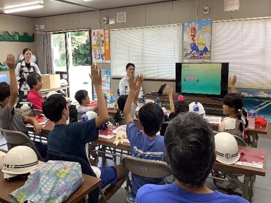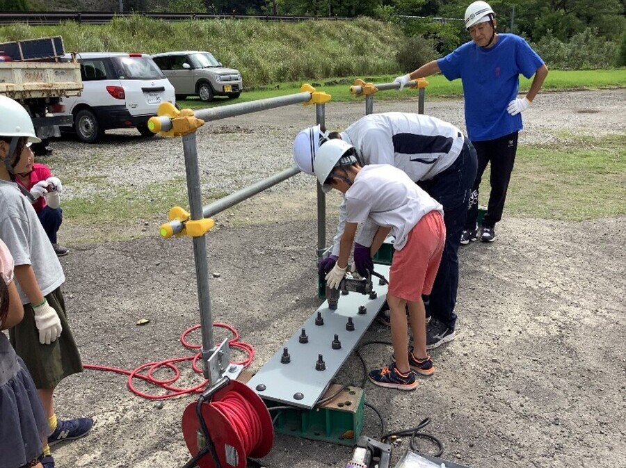 橋梁付近に位置する小学校の児童を対象に、橋の仕組みや社会的な役割についての理解を深めてもらうことを目的として、橋梁見学会を開催しました。 はじめに、橋の概要や公共事業について簡単な説明を行った後、現場で当て板を取り付ける作業の見学を行いました。さらに、ボルト締めの体験や、補強鉄板の上を歩いてたわみを感じてもらい、補強効果を体感するなどの体験学習を実施し、最後にクイズ大会を開催しました。特にクイズコーナーは大盛況で、座学で学んだトラス橋も覚えていただき、たくさんの喜ぶ声が聞けました。 |