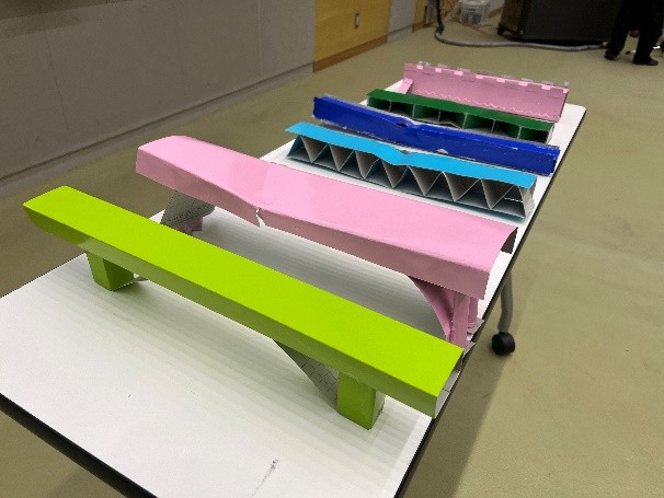 『ぶりわんグランプリ』では、色付きの工作用紙を使用して、各班自由な発想で橋を製作してもらいました。強度を重視して強い構造を目指す班もあれば、デザイン性を意識してアーチ橋を製作した班もありました!載荷試験では、ペットボトルを6L載せても耐えられる橋もあり、大いに盛り上がりました!