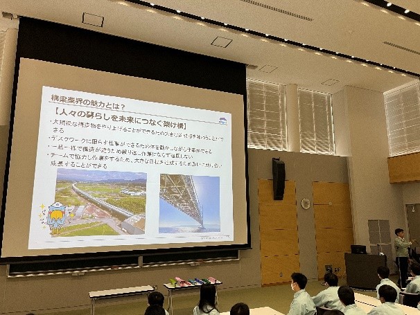 講義の最後には、橋梁業界で働く若手社員の仕事を紹介しました。「なぜ橋梁業界を選んだのか?」「橋梁業界の魅力って?」といった内容もお話しし、生徒の皆さんは興味津々の様子でした。
