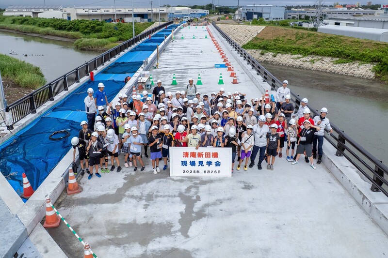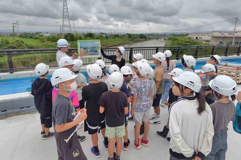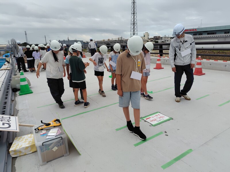 | 静岡県袋井土木事務所のご協力の元、現場近くの福田小学校の5・6年生を清庵新田橋の現場に招待しました。土木を身体で感じてもらうことを目標に、高さ・距離を感覚で当てるゲームをしました。またクイズ大会では、橋に関するクイズを出しましたが、皆さんの正解率が高いのがとても驚きでした。将来、皆さんと一緒に仕事がしたいですね。 |