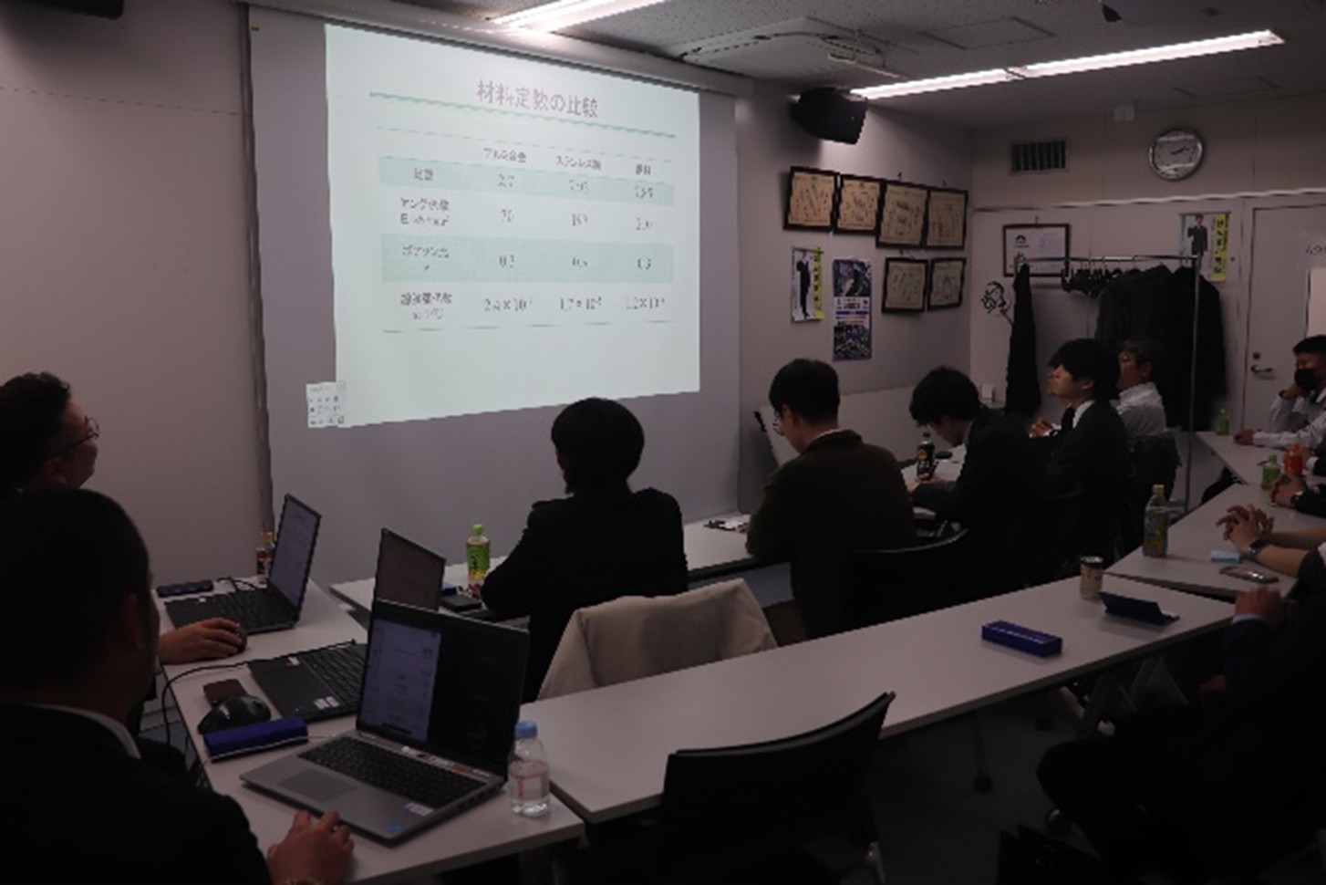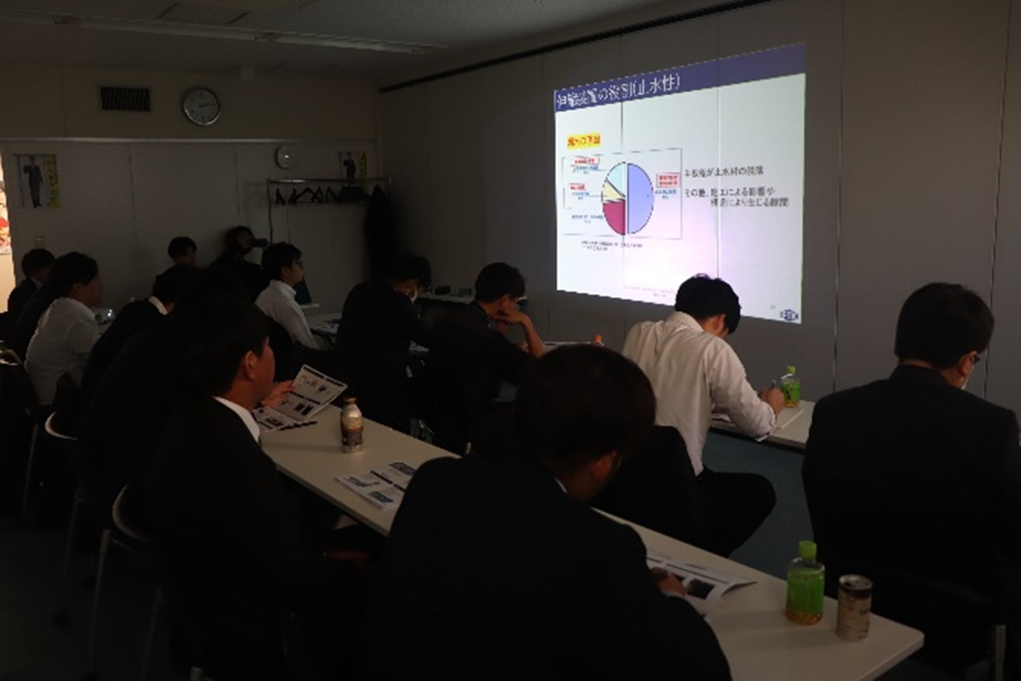 当日は、44名(事前申し込み44名、欠席者なし)の若手技術者が4班に分かれて、各班が賛助会員4社のブースに移動して各社の説明を受ける形で進行しました。各ブースでの説明を受けた後の質疑応答も積極的に行われており、新しい知識を吸収しようとする姿はとても好感が持てました。
