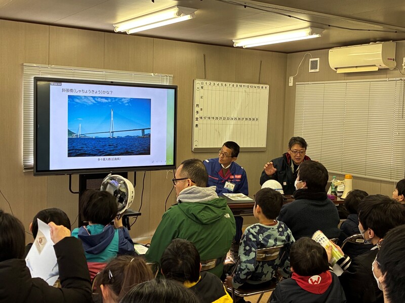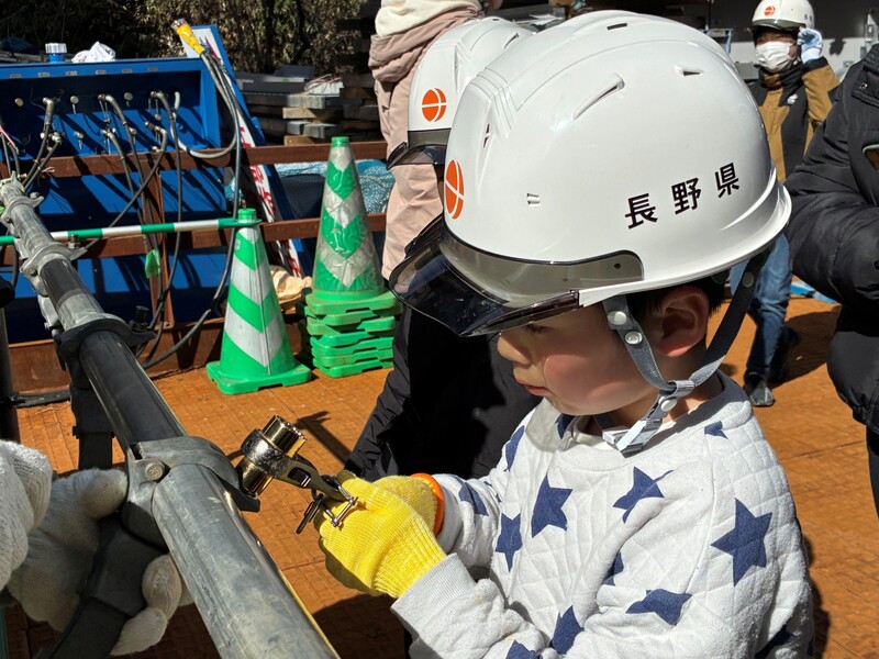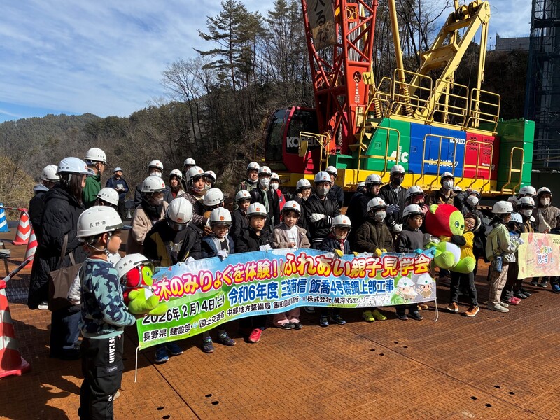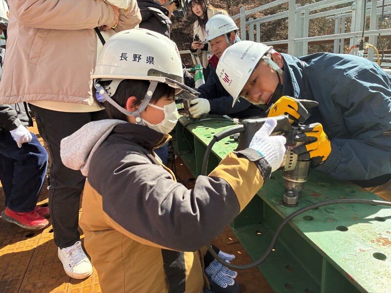 | 担い手確保のために毎年実施されている長野県主催の「ふれあい親子見学会」に協力しました。最初は室内で橋の作り方をパワーポイントで説明しました。その後現場に向い、下から橋梁を見学し、ボルト締め付け体験とクランプ取り付け体験を行いました。児童からは記念に体験で使用した高力ボルトをもらえて嬉しかったと好評でした。 |