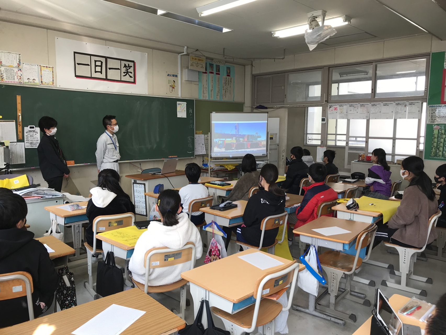 当初、1月25日に現場見学会を企画しましたが、まん延防止措置発令のため、中止いたしました。見学会ではない別の方法を検討し、工事の実作業を動画撮影・編集し、小学校にて動画視聴会を実施いたしました。 発注者監督職員もご同席いただき、動画を見ながら工事の説明や、東日本大震災発生日である事も踏まえて、土木の素晴らしさを説明させていただきました。 他のクラスの生徒さんには時間の関係上、直接説明はできませんでしたが、学校へ動画を提供し、後日視聴いただけるようお願いいたしました。 |