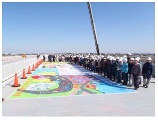 圏央道の柴山枝郷地区高架橋(駒井ハルテック施工)、下大崎地区高架橋(日本橋梁施工)に近接する4つの小学校に、事前に絵を描いてもらい橋面でつなげるというイベントを通じて、圏央道の役割や地域とのかかわりなどに興味を持ってもらい、建設現場のリアルを体感してもらうことを目的に開催しました。